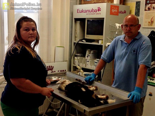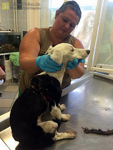 Sok mindent láttunk már, de ez minden brutalitáson túl tesz. Nehéz lesz a látványt elfelejteni – mondták portálunknak Antal Laura ajkai gyepmester és dr. Színesi András állatorvos, miközben a doktor a szenvedő kiskutyának beadta a megváltó injekciót. A kis keveréket szemtanúk szerint egy kék furgonból dobták ki egy másik kutyával együtt, napokkal ezelőtt Somlójenőn. Az egyik eb derekára valamilyen ruganyos madzagot kötöttek, amit olyan erővel húzhattak, hogy az gyakorlatilag kettévágta a kutya testét, sebeiben nyüvek lakmároztak, széttört, szétzúzott bordái között szabad szemmel látható volt apró dobogó szíve.